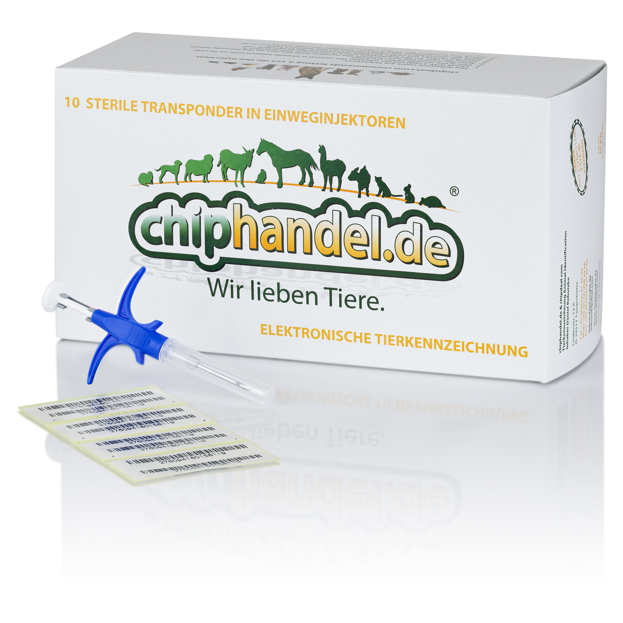 - Sie erhalten 8 Barcode-Label pro Chip für entsprechende Dokumente wie den Heimtierausweis, Impfausweis usw. Ihres Tieres.